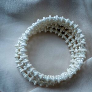 Deze armband is handgemaakt door een San-gemeenschap in Namibië. De San zijn de oorspronkelijke inwoners van Zuidelijk Afrika. Hun traditionele manier van leven als jager-verzamelaar wordt steeds uitdagender. Met de aankoop van deze armband steun je hun in het levensonderhoud.